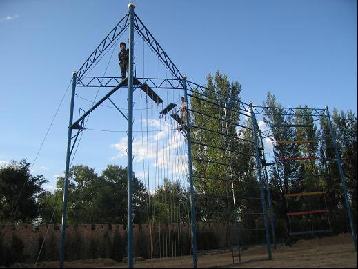本套拓展器材從心理學角度入手,從天梯之間的距離、器械總體高度等方面都做了非常嚴密的設計,使其更加符合人的心理規律;從器械學角度來看,該設備做了組合型設計,減少了占地面積;
