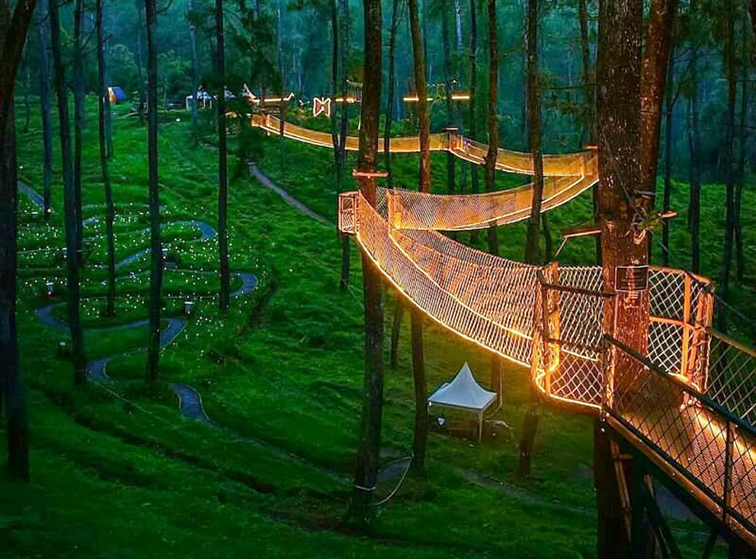 這是一款沉浸式森林主題室外拓展游樂設備,以天然林木為支撐,打造出蜿蜒穿梭于林間的高空網道與平臺,搭配 LED 燈帶在夜間點亮,營造出夢幻的星芒森林氛圍。主體采用高強度鍍鋅鋼絲網與鋼材框架構建,既保障了結構穩固與游玩安全,又最大程度保留了森林的自然風貌。設備集高空行走、林間穿越、夜間打卡于一體,適用于自然景區、森林營地、研學基地等場景,讓游客在離地的棧道上感受森林的靜謐與壯闊,同時鍛煉平衡感、勇氣與探索精神,是白天親近自然、夜晚邂逅星光的理想游樂選擇。