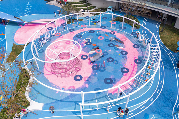 這是一款以 “月亮與星空” 為設計靈感的沉浸式戶外游樂設施,整體采用夢幻藍粉漸變配色,地面印著錯落的星空圓環圖案,營造出浪漫的宇宙氛圍。
