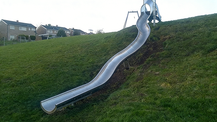 這是一款依托自然草坡地形打造的戶外不銹鋼滑梯,采用流暢的波浪形設計,銀亮的金屬質感與翠綠的草坡形成鮮明視覺對比,造型簡約現代且與自然環境高度融合。