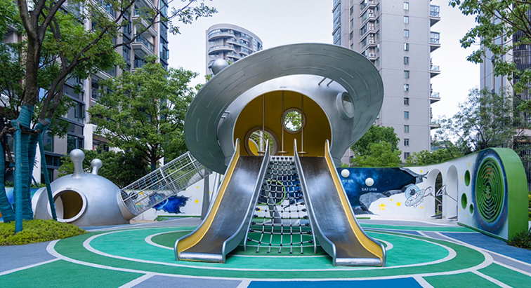 設備集多元游樂功能于一體:雙滑梯設計帶來俯沖滑行的刺激,中心的攀爬網可鍛煉孩子的肢體力量,周邊的球形鉆行通道與環形步道豐富了探索與社交體驗。它采用環保耐用的戶外材質,圓潤的邊角設計保障游玩安全,適合安置在社區綠地、城市公園、親子樂園等場景,既能讓孩子在模擬星際探險的情境中釋放想象力,也能憑借極具辨識度的飛碟造型成為場地的吸睛打卡點。