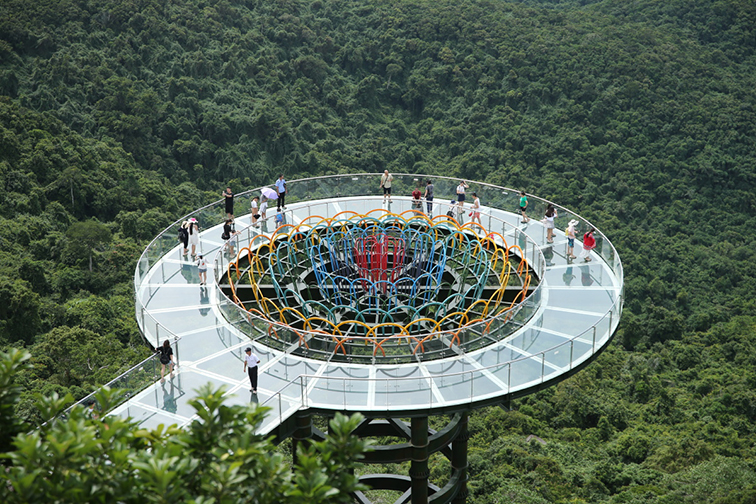 游客漫步于全透明玻璃棧道,可 360° 俯瞰層疊茂密的雨林景觀,感受凌空于林海之上的驚險與治愈;中心的彩色藝術裝置既是視覺焦點,也是拍照打卡的熱門場景,適配觀景愛好者、網紅打卡群體及家庭客群。